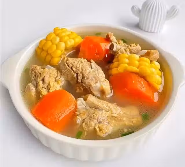 4、一小時後加入玉米燉20分鐘,燉出玉米的清香再加入胡蘿蔔和提前泡好的蟲草花,加適量鹽攪拌均勻調味。燉至胡蘿蔔熟透即可。