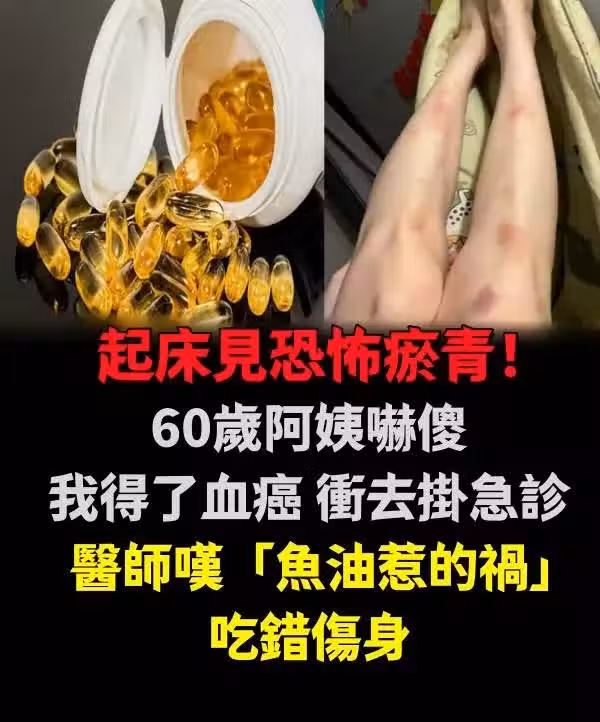 起床驚見恐怖瘀青!60歲阿姨嚇傻「我得了血癌」衝去掛急診 醫師嘆「魚油惹的禍」吃錯傷身!!