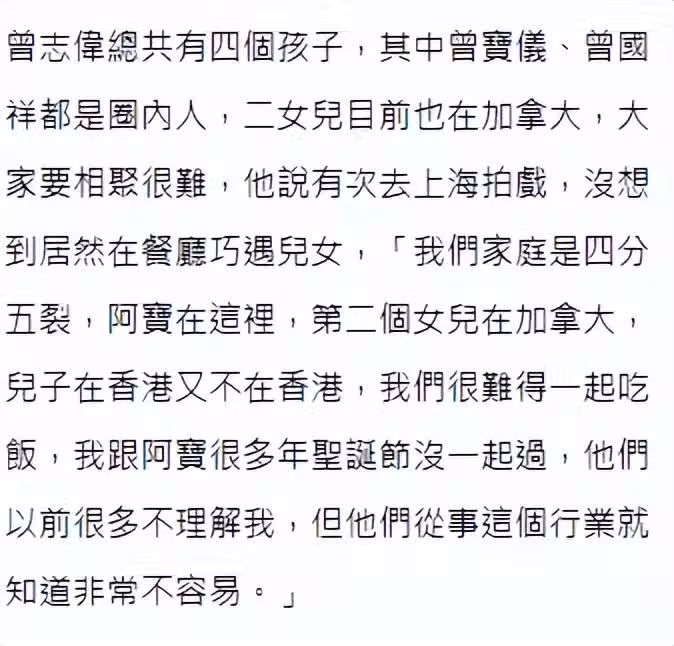 71歲的曾志偉現在兩鬢斑白,坦言自己的家「四分五裂」,曾寶儀在中國台灣,二女兒曾詠儀在加拿大,兩個兒子一個在中國香港一個在外地,一家人很難得一起吃飯,他認為子女以前不理解自己,後來入行後才發現他的不易,還說有一次去上海拍劇,竟在飯店偶遇兒女,難得吃上一次飯。