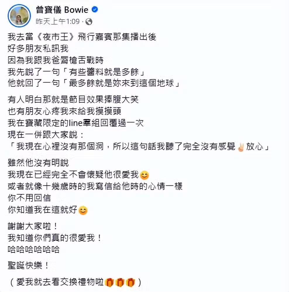 曾寶儀經歷了母親不幸婚姻以及抗癌的艱辛,想來早已看透人生,對於被父親說「多餘」,她十分淡然,發文感謝大家關心,字裡行間都流露出對父親不抱任何期望。