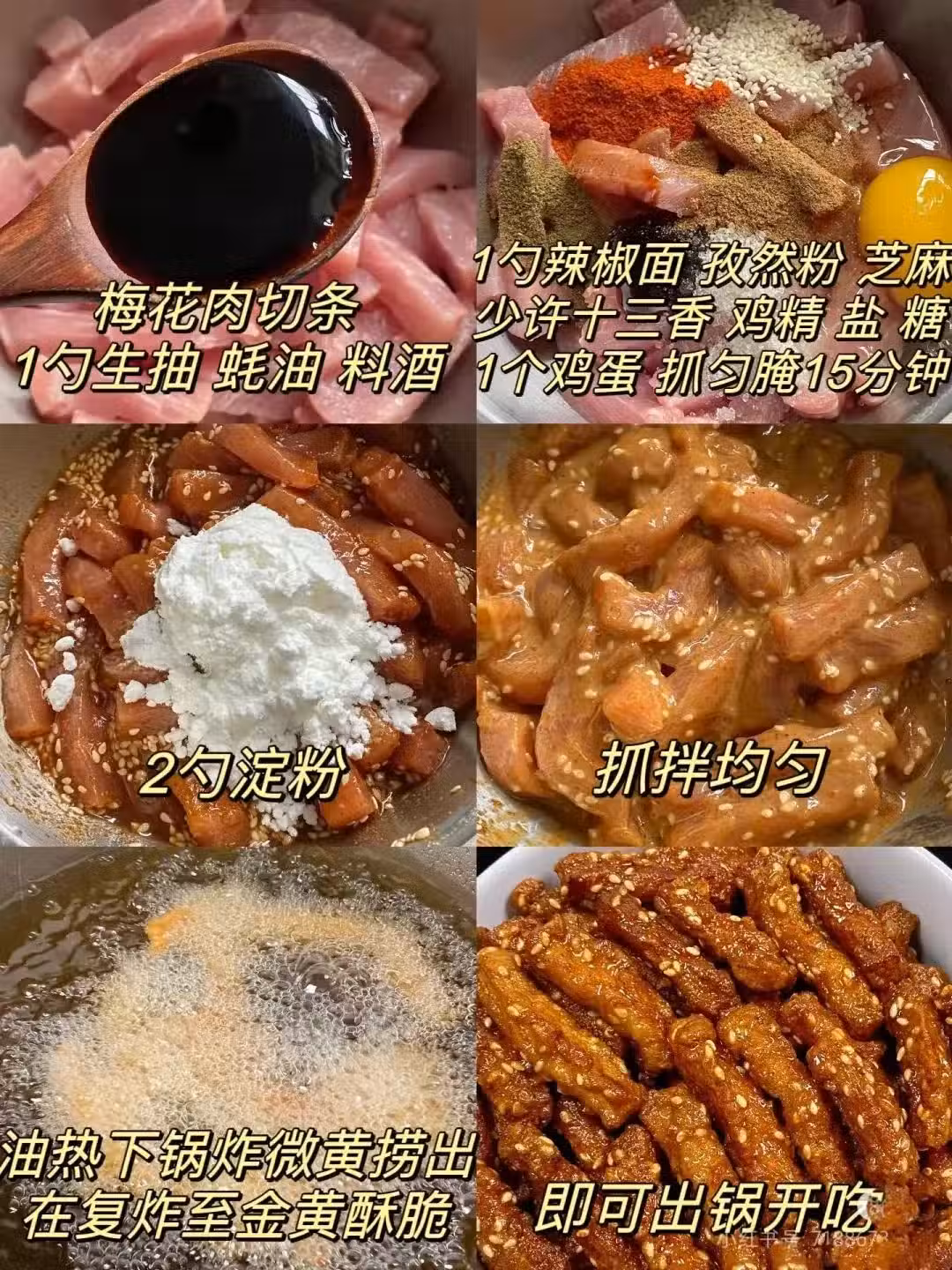 鍋中倒入足量油,待油溫升高後,下入裹好粉的肉條,炸至微黃撈出。待油溫再次升高後,復炸至金黃酥脆即可撈出。出鍋後的芝麻香酥肉,外酥里嫩,又香又辣,讓人回味無窮。