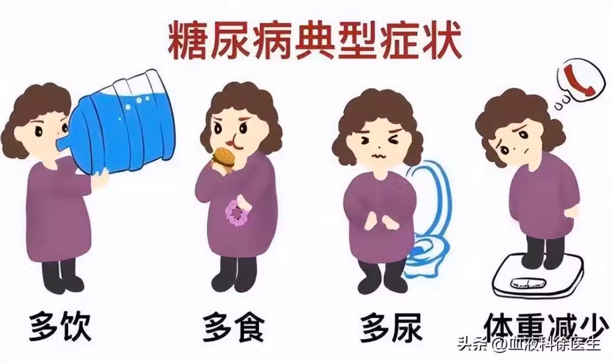 常見的糖尿病典型的表現為「三多一少」,即多尿、多飲、多食、體重減輕。上文的張大叔也是在發病前出現了明顯的「三多一少」症狀。