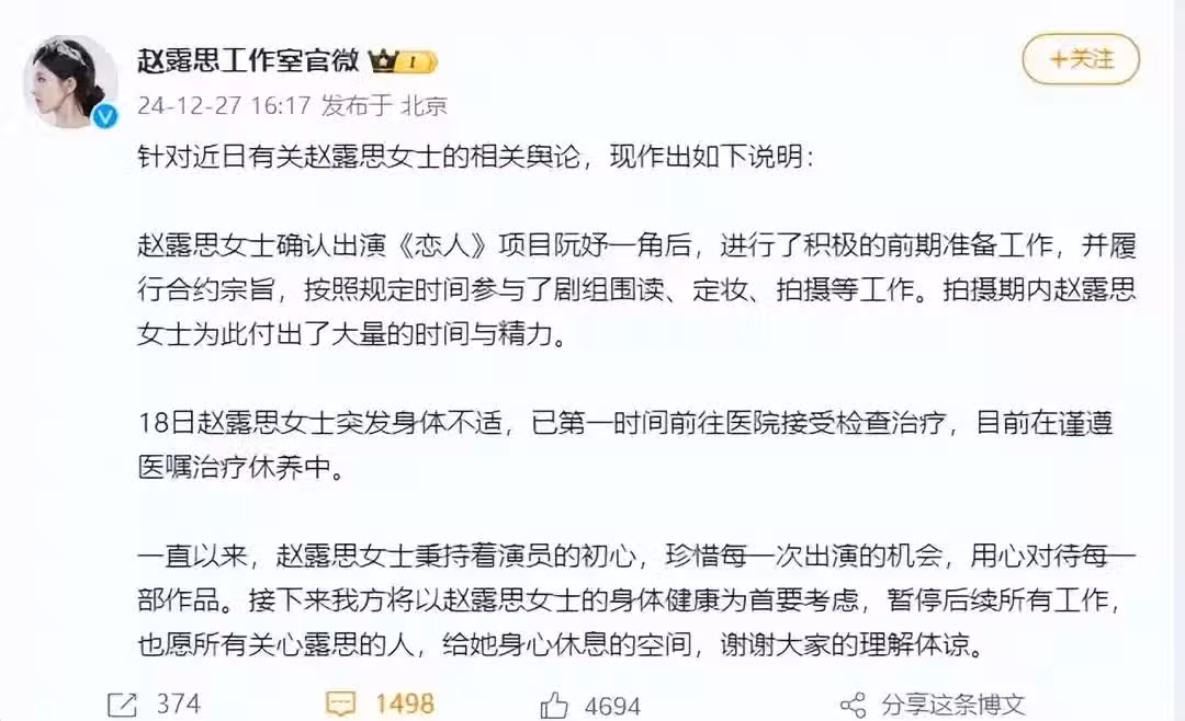 12月16日,趙露思的病情明顯加重,而在17日更是被緊急送往醫院接受治療。這一系列事件無疑為她的健康狀況蒙上了一層神秘的面紗。一時間,關於趙露思病情的猜測四起,有網友擔憂她是否因過度勞累導致身體崩潰,也有猜測稱或許與減肥過度有關。