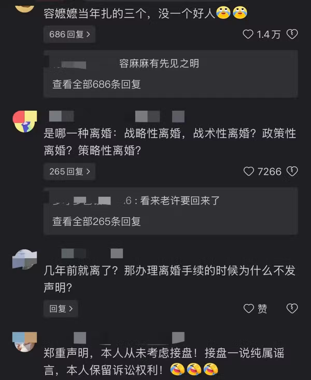 還有網友表示,這樣的離婚是不是「戰術性」或者「戰略性」離婚?也有網友認為,有錢人的套路我們是不懂的,多年前消失不見,這會兒又出來露頭,難道事兒擺平了?更有網友質疑,雖然名義上離婚了,說不定倆人私底下天天在一起。
