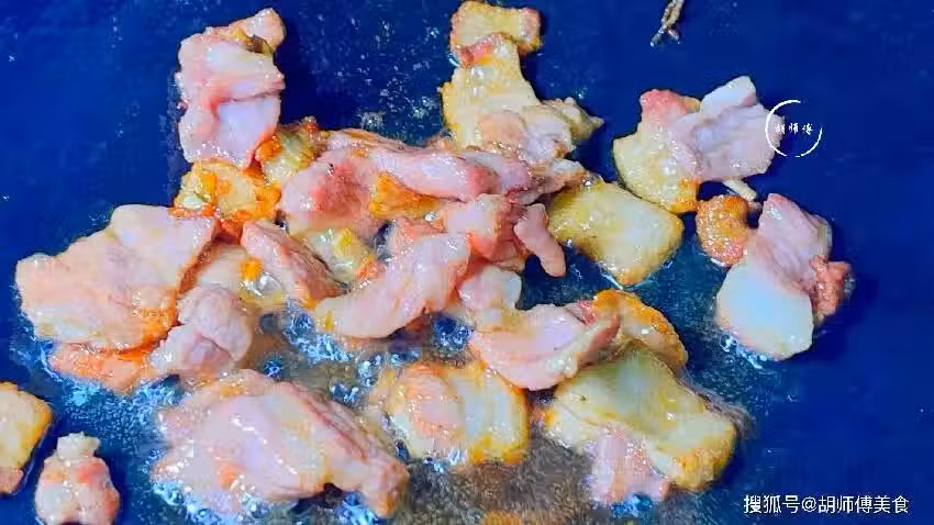 第四步:把切好的肥肉放入到鍋中,將肥肉中的豬油都炸出來後,然後把瘦肉放入到鍋中,大火炒制20秒,接著再把老抽、薑末、花雕酒放入到肉中,繼續炒15秒。