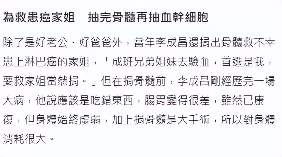 李成昌除了好爸爸及好丈夫,還是好弟弟,他的姐姐多年前不幸患上淋巴癌,家人都去驗血,只有他的符合捐骨髓,在此之前,李成昌曾大病一場,腸胃變得很差,儘管如此,李成昌還是願意捐骨髓救姐姐,第一次不是很理想,又抽了一次血幹細胞,可惜最終還是沒能救回姐姐。