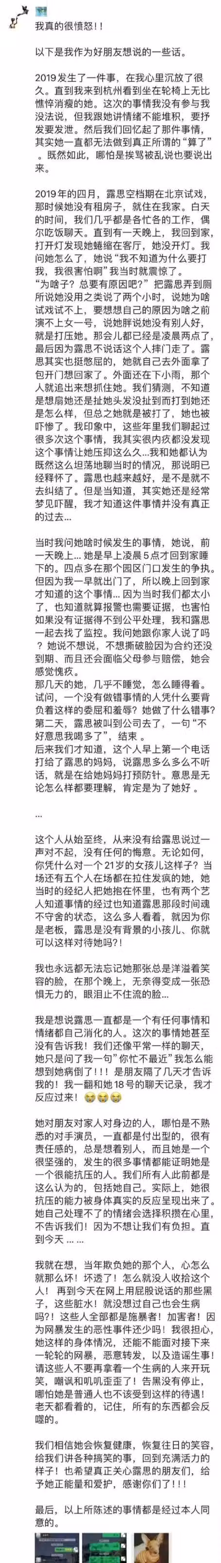 那時候趙露思還是跟這個爆料的閨蜜住在一起的,趙露思回家後就蜷縮在沙發上哭泣,然後和閨蜜說了自己被打的事情,閨蜜聽後非常氣憤,拉著趙露思就去調監控,有想過報警,但最後卻不敢報警,一是因為她們當時年紀都太小了,什麼都不懂,二是害怕沒有證據,報警也沒用。