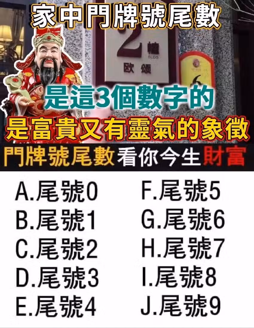 門牌號尾數是8門牌號尾數是8的人,在易數大吉,居住在屋子裡的人會平安吉祥,子女孝順,父母健康,家財暴增,喜事連連,若家中有添丁大壽之喜,更是旺上加旺!門牌號尾數是9門牌號尾數是9的人,在五行相生,居住在屋子裡的人會家庭和睦,平安順心,行事大吉大利,為人受人尊敬,鄰里和睦,親朋相助,全年財運亨通,萬事大吉。