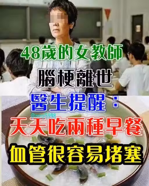 48歲女教師腦梗離世,醫生勸告 :天天吃2種早餐 ,血管很容易堵塞!