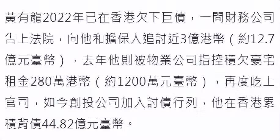 據不完全統計,黃有龍拖欠超10億人民幣(約合45億新台幣)的債務,而且利息巨高。