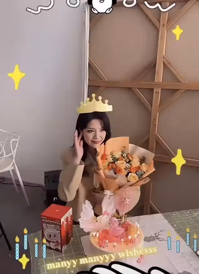 陳曉華的手中捧著一束鮮花,面前的桌子上還擺放著一個大大的生日蛋糕,蛋糕上面有隻粉色的天鵝,上面還插滿了蠟燭,看起來少女心滿滿。