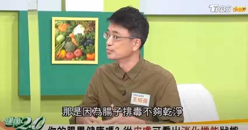 王明勇表示腸子排毒不幹凈,毒素就會跑到皮膚里,「如果你血液很污濁、血液毒素很多,你的皮膚絕對不會好看的」。