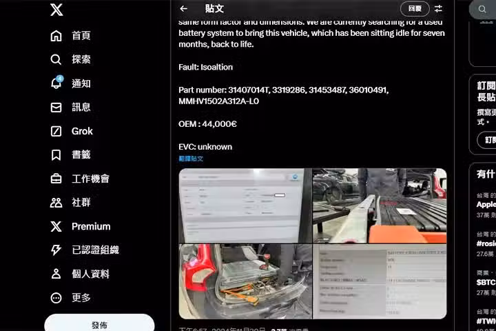 日前位於克羅埃西亞,提供第三方維修廠技術支援的車輛研究單位 EV Clinic,於社群平台公布 1 輛 2015 年、總行駛里程 50 萬公里的 Volvo 插電式油電混合動力車 V60 PHEV,所進行總電量 11.8kWh 的鋰電池組更換作業,EV Clinic 評估這組鋰電池因膨脹需要換新,不過引起各界關注的是,電池組更換成本將近 4.4 萬歐元 (換算約新台幣 150 萬元 ) 。