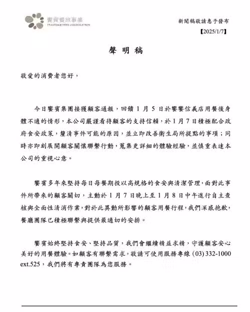 ▲饗賓集團針對「INPARADISE饗饗」信義店疑爆出食物中毒一事,發出聲明。(圖/饗賓餐飲集團提供)