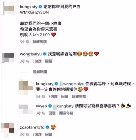 龔嘉欣留言寫道:「謝謝你來到我的世界,屬於我們的一個小故事,希望會為你帶來驚喜,明晚8 Jan 21:00 」黃翠如留言:「我差點誤會了啊。」而楊秀惠更問:「請問可以寫恭喜恭喜嗎?」龔嘉欣認真回覆:「你要再等一下,到真的時候,我一定會偷偷地通知你。」