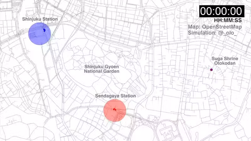 在兩座車站同時放出1,000位瀧與三葉,行走速度設定為「分速80米」,移動方向隨機