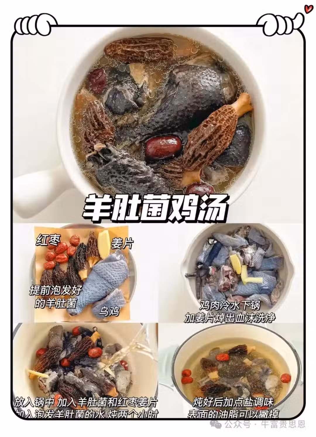 羊肚菌8 - 10顆,紅棗5顆去核,烏雞半隻切塊,薑片、蔥段適量。