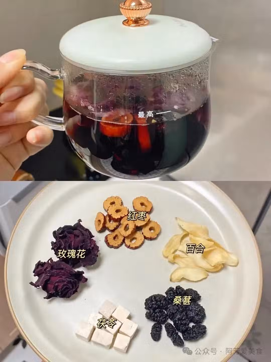 桑葚茶,它的口感不會很甜,也不會說很苦。加入的百合恰到好處,和桑葚和還有紅棗融合,甜味就沒有那麼的重了。還有濃濃的玫瑰花香,讓人有想喝的慾望。