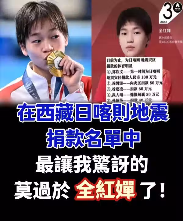 家人們,今天必須要來嘮嘮那個一出現就能驚艷全場的全紅嬋!最近,她又乾了一件讓所有人都對她豎起大拇指的事兒,在給西藏日喀則地震的捐款名單里,全紅嬋的名字赫然在列,這消息一傳出,直接在網上炸了鍋。