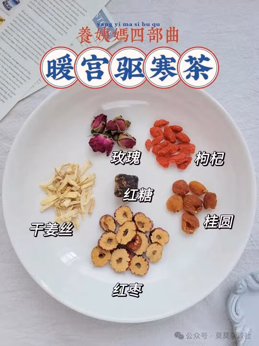 食材:紅棗 5顆 | 枸杞 10顆 | 乾薑絲 3克 | 桂圓 4顆 | 玫瑰花 6朵 | 紅糖 適量