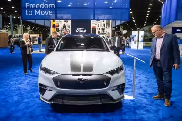 2023年9月14日,美國密西根州底特律,在北美國際底特律車展(North American International Detroit Auto Show)期間,現場展出福特(Ford)汽車新款2024年的野馬(Mustang)Mach-E Rally。(Matthew Hatcher/AFP)