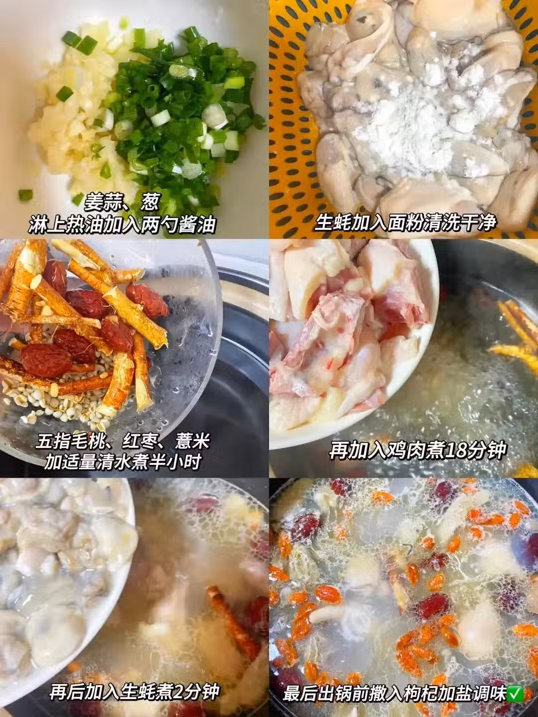 3. 然後加入雞肉,繼續煮18分鐘。加入生蚝,煮2分鐘即可。