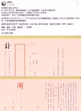 值得一提的是,徐明正生前始終堅持理念,他曾在社群平台表明立場:「50年的民主鬥士不是為任何黨派,而是為了台灣的民主,讓主權真正歸屬人民。