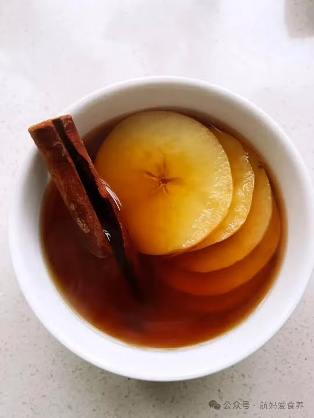 【食材】:蘋果1個,肉桂1根,紅茶5g 【做法】:肉桂先煮10分鐘,再下入切片的蘋果煮10分鐘,再加入紅茶煮2分鐘即可。(喝湯吃蘋果) 肉桂補火助陽、引火下行;蘋果煮熟了養中焦滋陰液,收斂肉桂的溫性;再加上一點紅茶,除了暖中焦,還有一些"泄"的作用。 整個湯方有補有泄,暖而不燥,非常適合上熱下寒的人。當然肉桂還可以搭配小米煮粥,或者蘋果肉桂一起煮粥,對於上熱下寒都是很好的。
