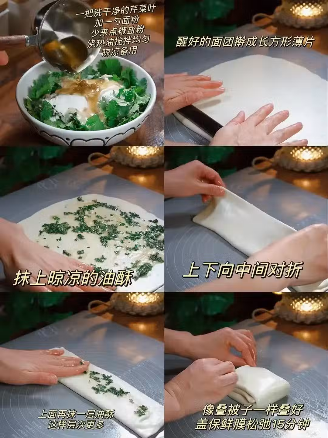 5、鬆弛好的餅胚再次擀開,這次要擀得更薄一些。餅擀得越薄,烙出來的口感就越好,外皮酥脆,內里柔軟,層次分明。擀好的餅胚薄如蟬翼,透著油酥的綠意,讓人忍不住想要立刻品嘗。