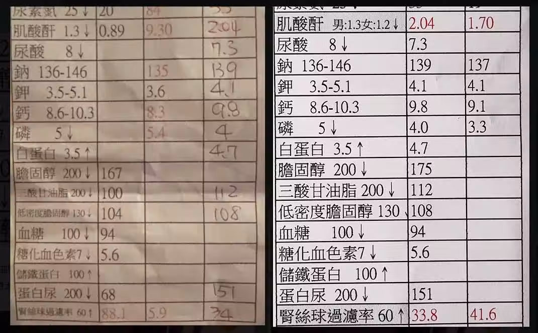 王喜突然公開兩張體檢報告的指數透露患上腎衰竭。