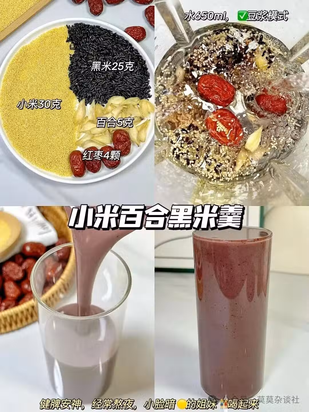 黑米補腎養血、小米健脾養胃、百合安神潤肺,再加上紅棗的「甜蜜助攻」,特別適合那些經常熬夜、臉色暗黃的姐妹們。