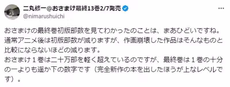 「根據數據顯示,銷量減少的時間點正是動畫發生作畫崩壞的時候。
