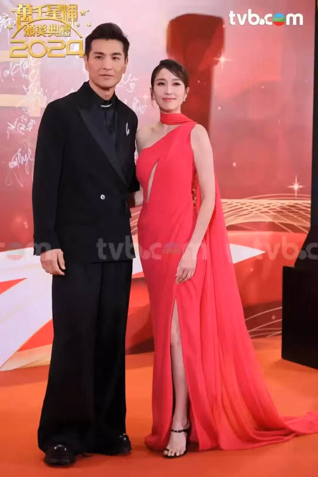 姚子羚穿了一條玫紅色斜肩長裙,因為她顏值高、膚色偏白、身材纖瘦,所以能把一條普通的裙子穿出讓人眼前一亮的效果。可是跟穿了黑色闊腿西裝褲的陳展鵬站在一起時,兩人就有點像交誼舞比賽上的搭檔了。