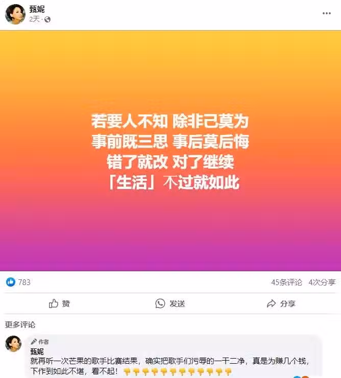事實上,歌手甄妮就曾發文炮轟《歌手》有內幕,冠軍都是內定的,三個月前就知道冠軍是誰,老外被當猴耍,當時還引起轟動。