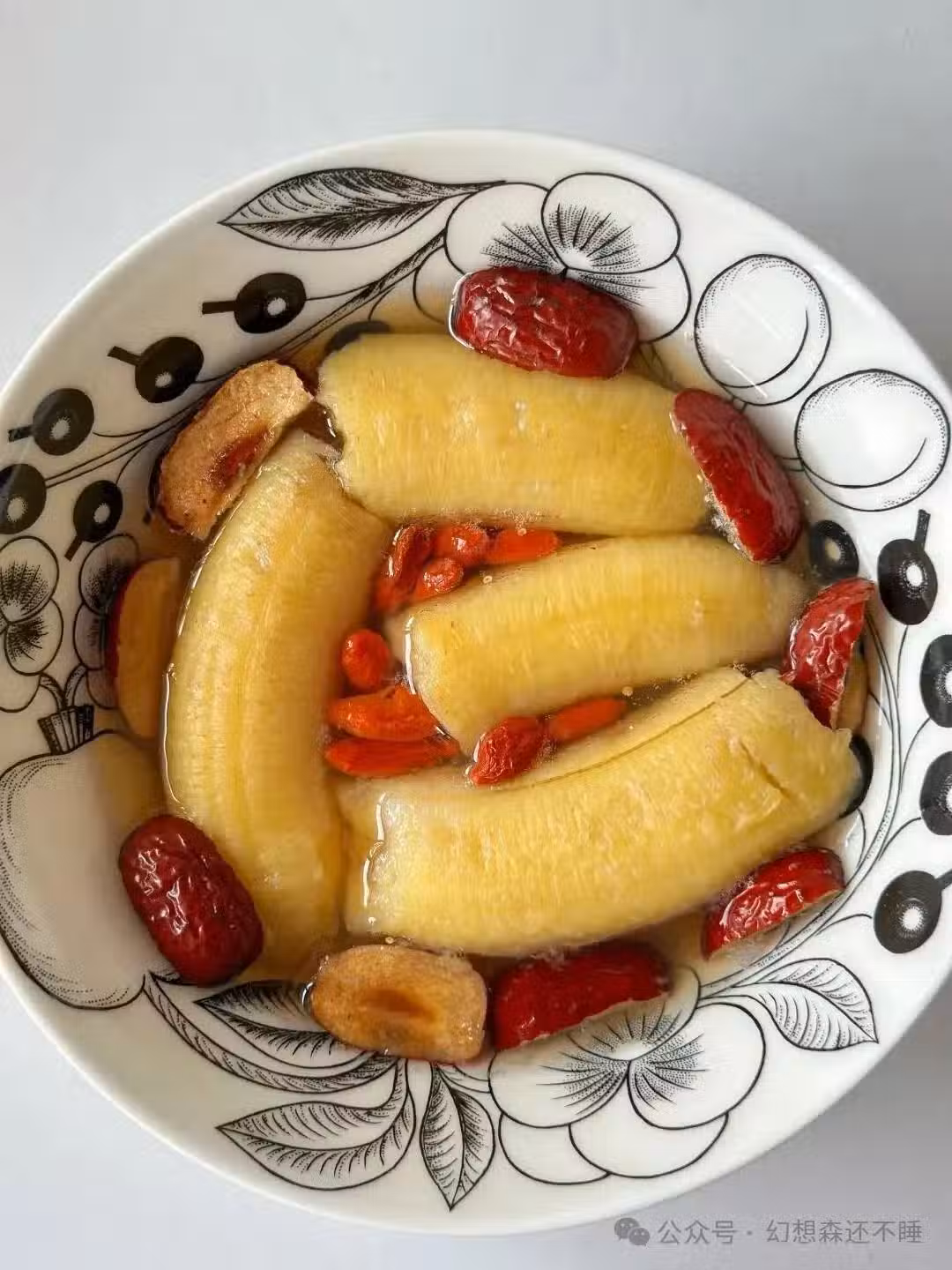 - 食材:熟透的香蕉1條、紅棗3顆、白冰糖適量、枸杞幾顆