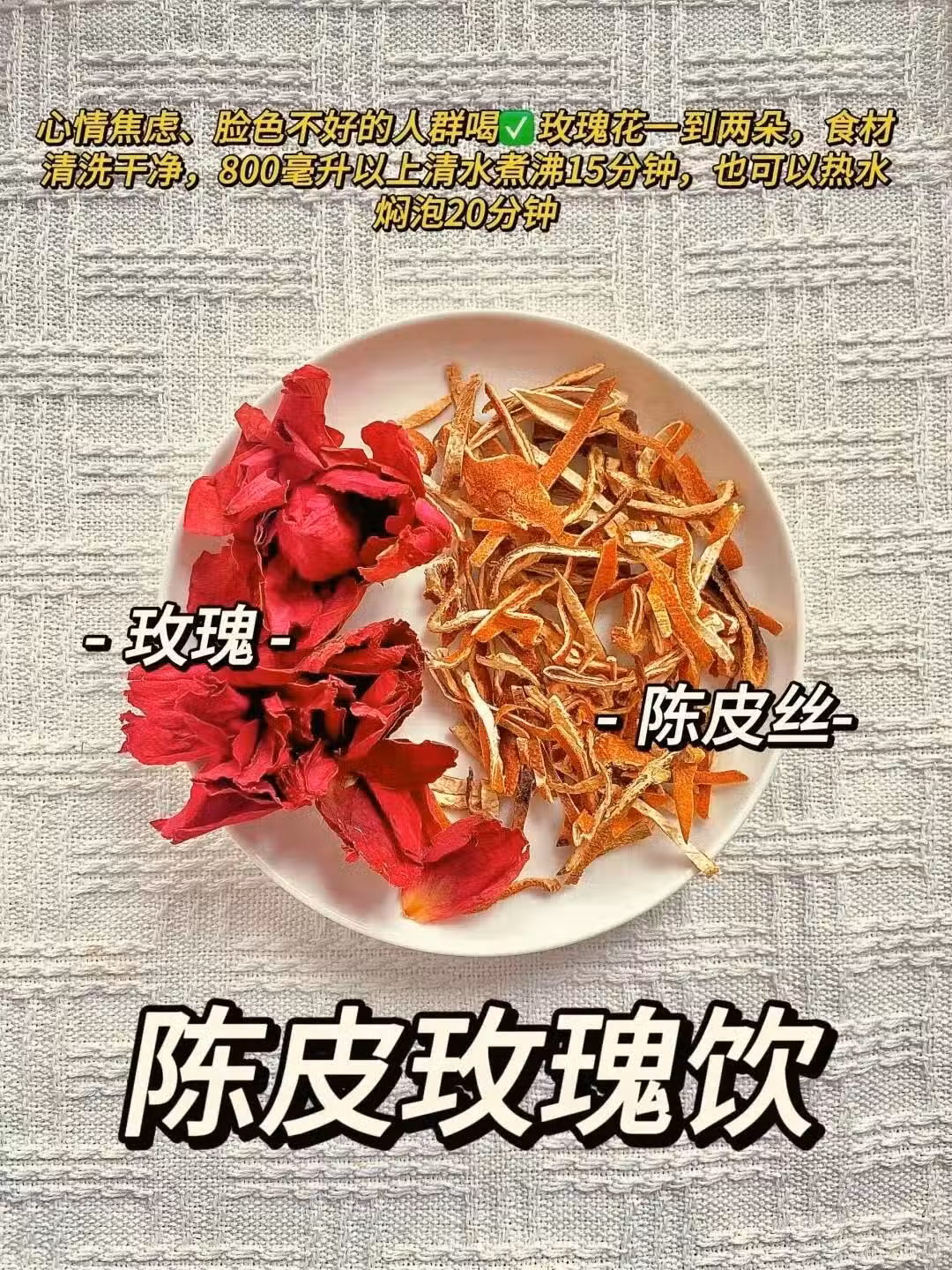 陳皮➕玫瑰 適合心情焦慮、臉色不佳者。陳皮理氣健脾,減輕焦慮;