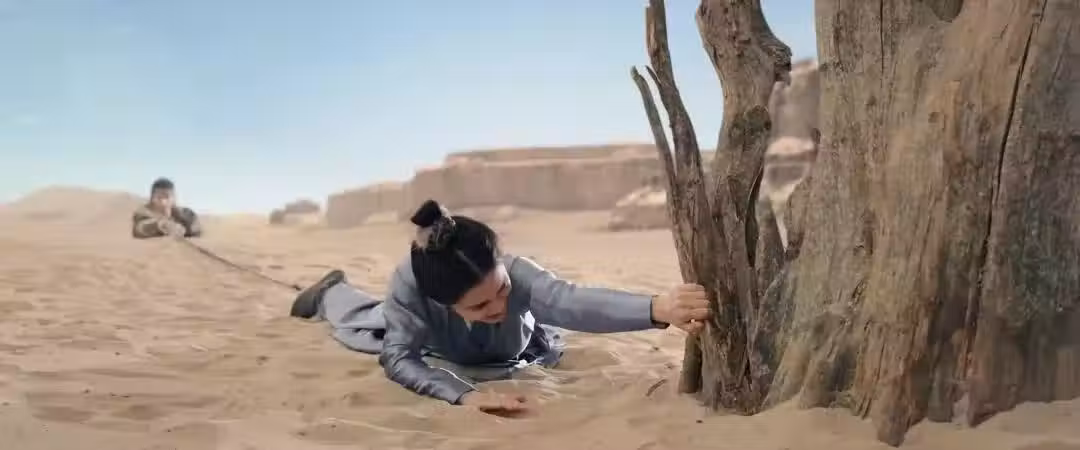 生死關頭,男主甩出鞭子,以女主身體為依託,讓自己不陷入流沙。