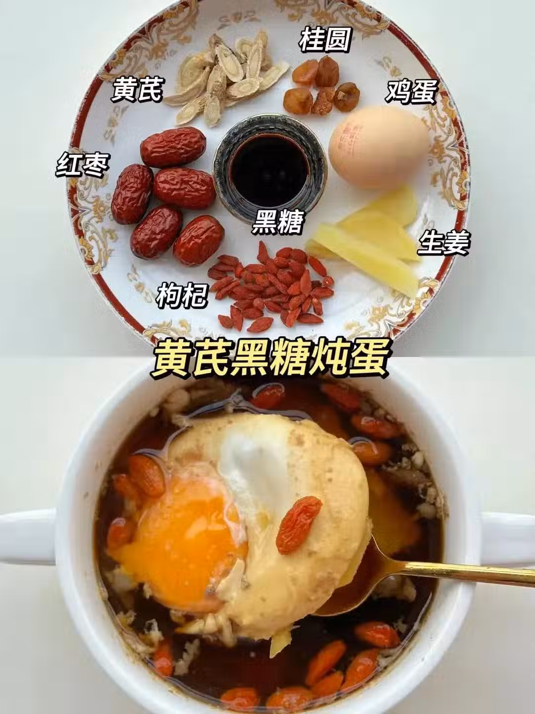 黃芪、黑糖、枸杞、紅棗、桂圓、生薑、雞蛋🥚