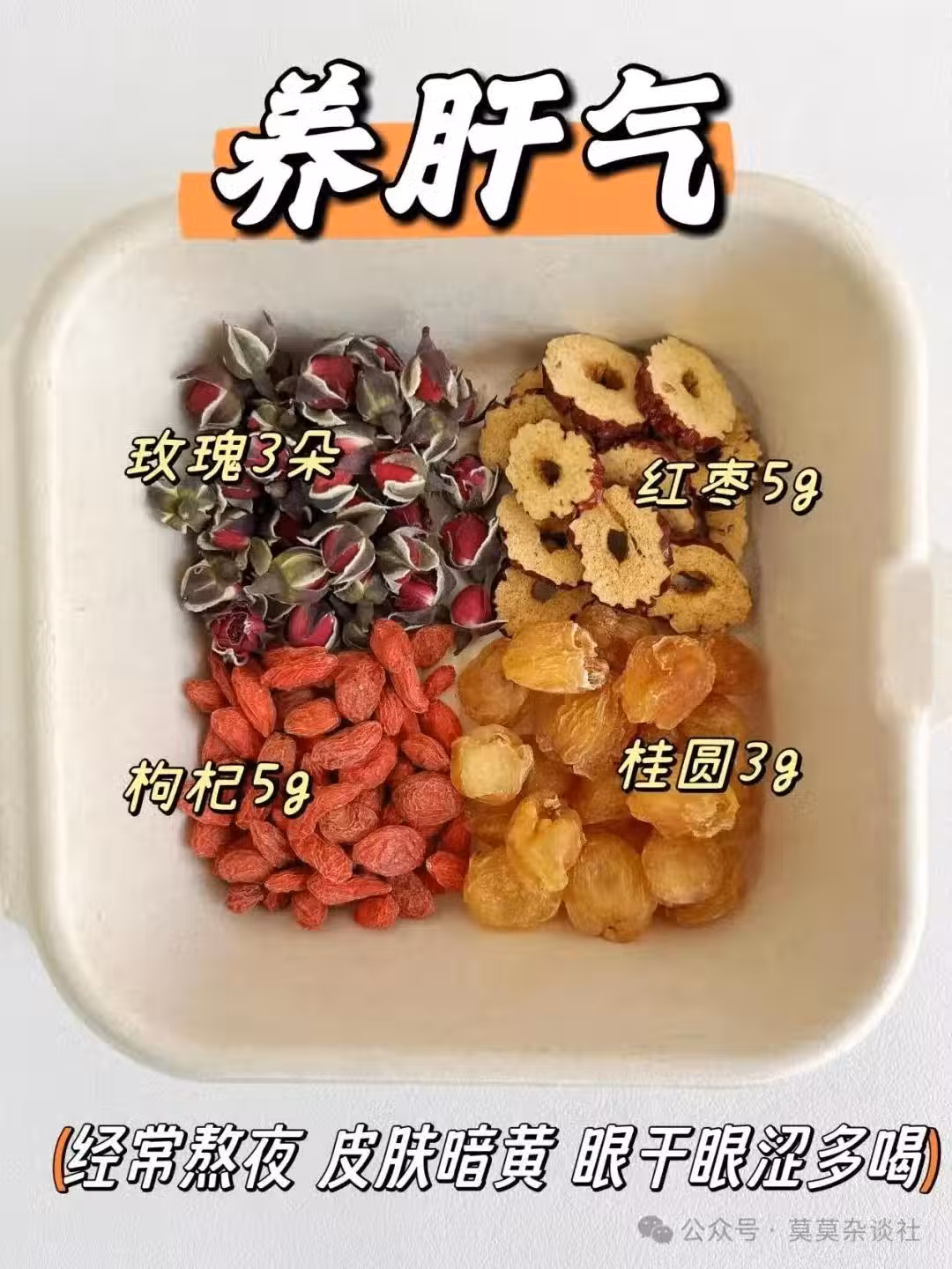 功效:如果你經常熬夜加班、皮膚暗沉無光、眼睛乾澀,那多半是肝氣不足了!這款茶不僅能補肝氣,還能讓你睡得香、臉色亮,連整個人的氣場都柔和起來。