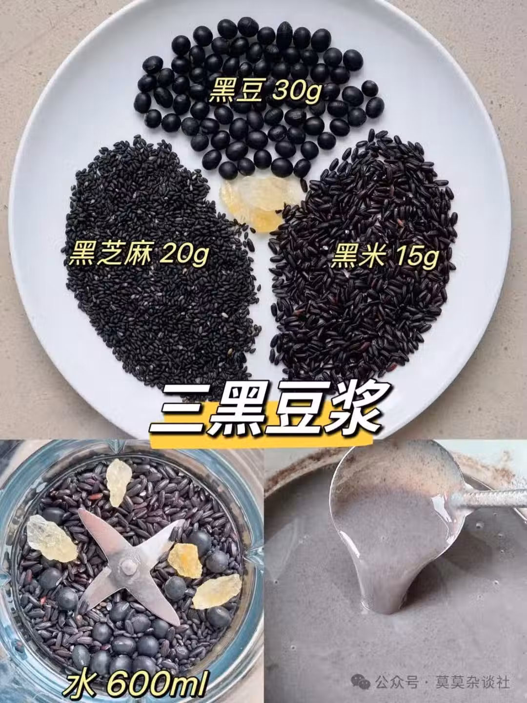 食材:黑豆 30g | 黑米 20g | 黑芝麻 15g | 水至破壁機600ml水位線