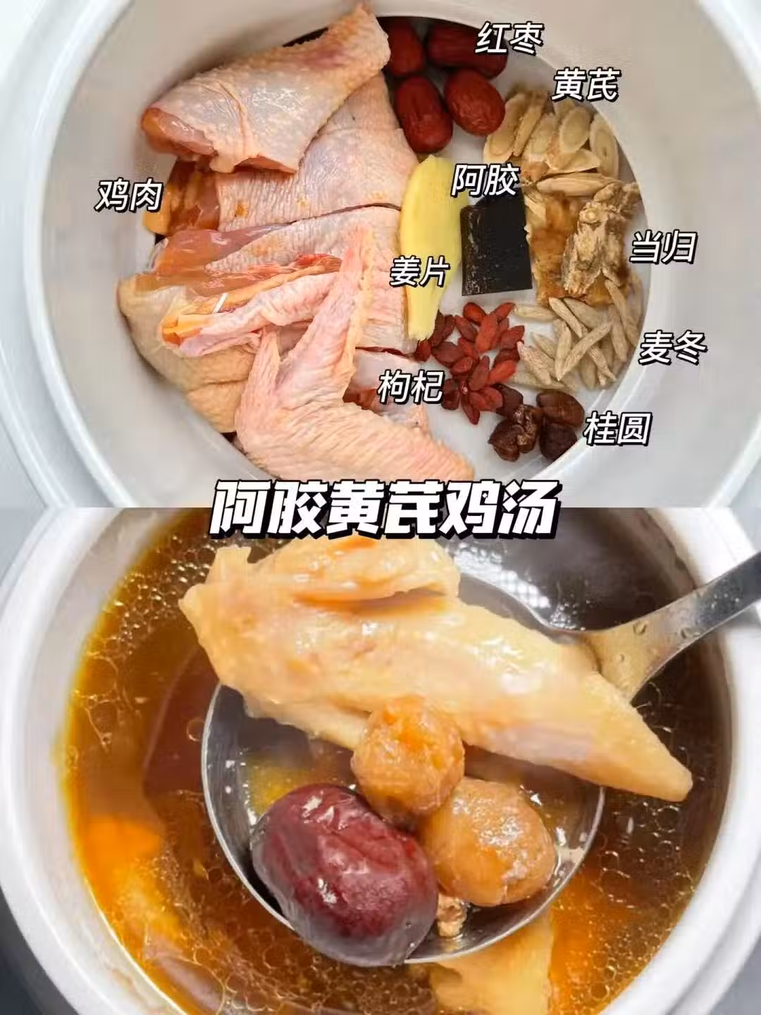 食材準備:雞肉 紅棗 黃芪 阿膠 當歸 麥冬 桂圓 枸杞 薑片