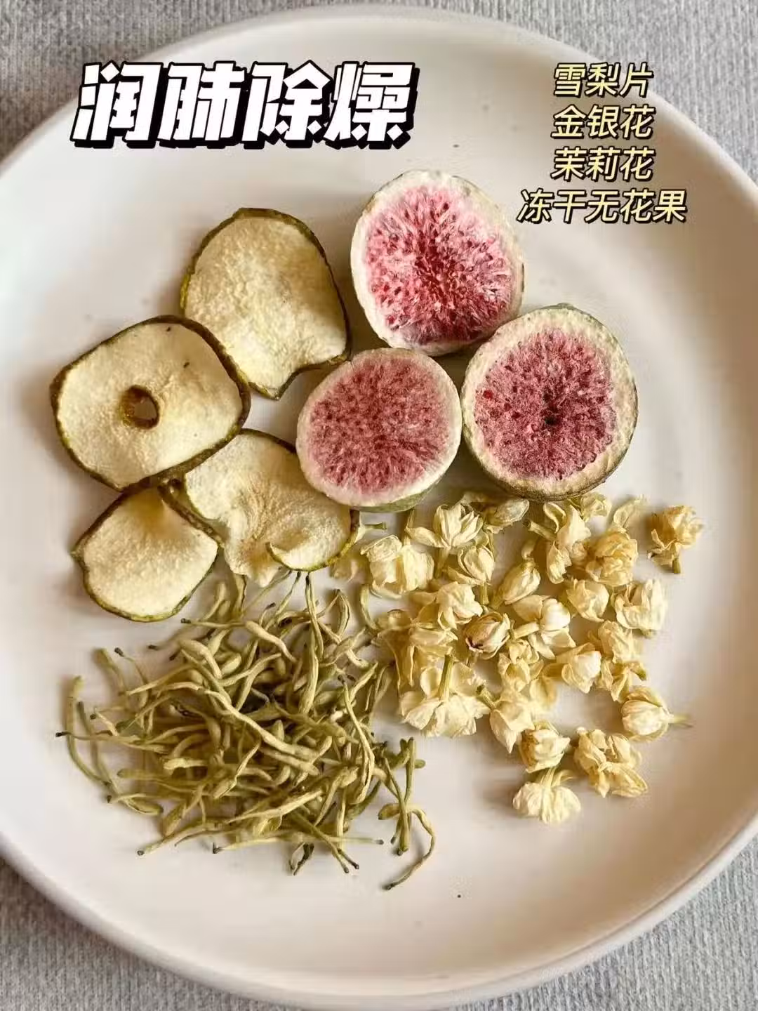 食材準備:雪梨片 金銀花 茉莉花 凍干無花果