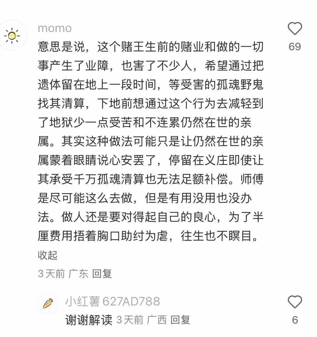 賭王生前的賭業產生了業障,連累了不少人,何家把他的遺體留在地上一段時間,等受害的靈魂找其清算,通過這個行為去減輕他下葬後所受的痛苦,以及讓在世的親屬感到心安。