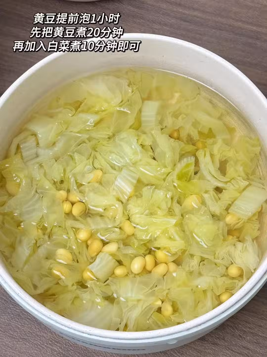 黃豆提前泡一小時,加水煮20分鐘後,加入白菜心,繼續煮10分鐘即可,喝湯,能吃菜更好…
