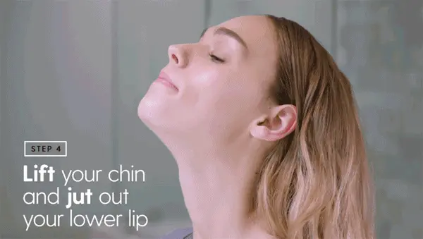 眼睛直視前方,把下巴抬起,整個頭往後傾。用雙手手指輕輕從下巴往鎖骨位置,從上至下輕輕滑過,不要太用力,放鬆你的頸部肌膚。