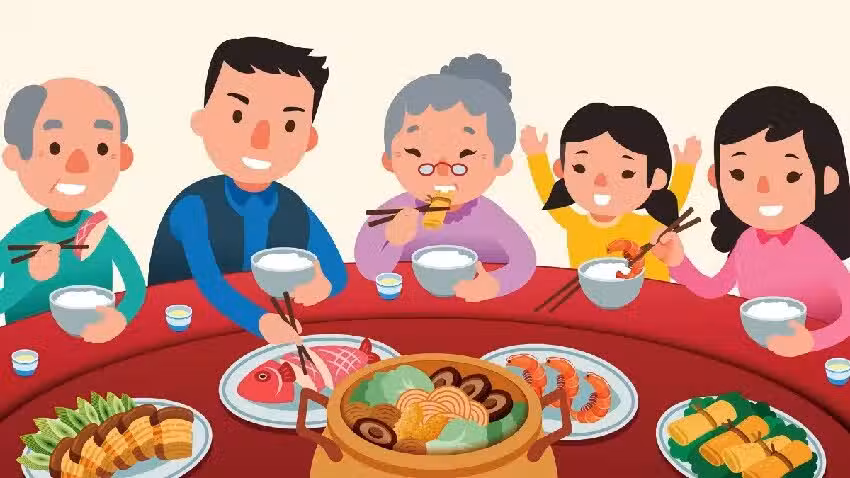 年夜飯象徵團圓,桌下放火爐,旁擺8枚錢幣寓意財運興旺。 若有家人不在,空出座位放衣物,表達團聚的意涵。