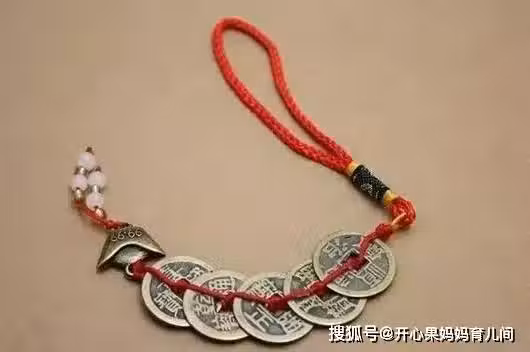 夫妻倆用紅紙包裹了8枚銅錢放在孩子枕頭邊。