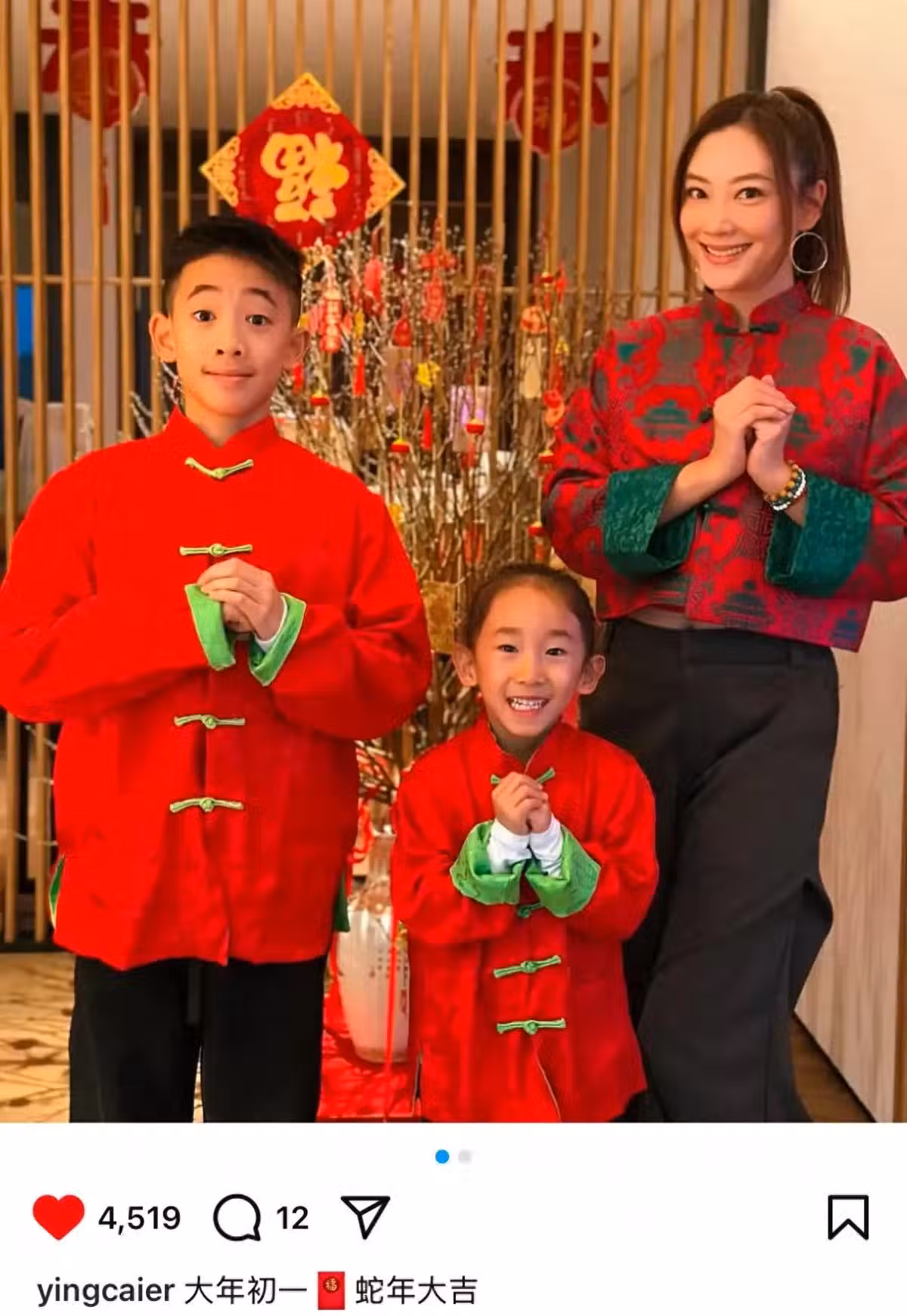 1月29日大年初一,應采兒在社交平台曬照,攜倆兒子給大家拜年「大年初一,蛇年大吉」。新年快樂!新年快樂!
