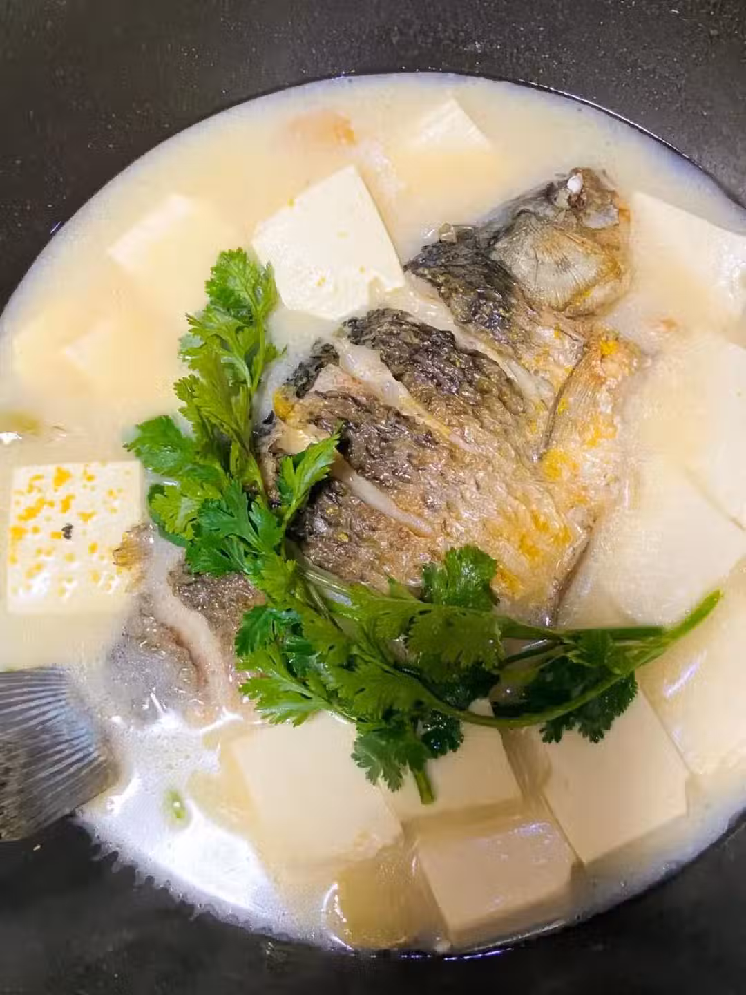 【材料】:鯽魚1條,嫩豆腐,香菜,姜,蔥白,白鬍椒,鹽