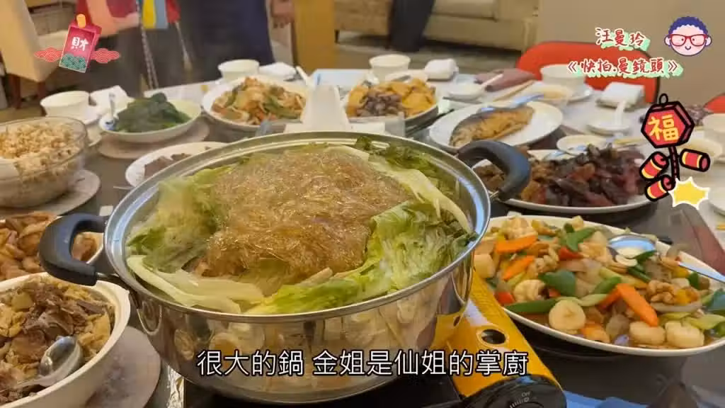 而晚飯的安排,汪曼玲曾說:「大年初一定有佛跳牆,是由仙姐的掌廚金姐親自炮製,有好多魚翅、鮑魚,還會有羅漢齋,下晝就一定會有茶點,金姐會安排馬蹄糕、蘿蔔糕和年糕等等。」